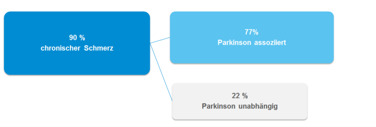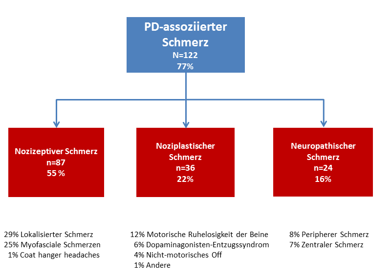 Nozizeptiver, neuropathischer und noziplastischer Schmerz traten bei 87 (55 %), 25 (16 %) bzw. 35 (22 %) Patienten auf. Parkinson-unabhängige Schmerzen konnten bei 35 (22 %) Patienten festgestellt werden. Der Schmerzscore des Fragebogens korrelierte mit Schmerzratings aus den anderen Fragebögen, mit der Anwesenheit von Dyskinesien, mit motorischen Fluktuationen, der Lebensqualität und dem Depressions- und Ängstlichkeitsscore.