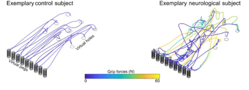 Eine wichtige Rolle spielt dabei der in der ETH Zürich neu entwickelte ‘Virtual Peg Insertion Test’, mit dem wir Bewegungsabläufe beim Ergreifen und Versetzen von virtuellen Objekten (in der Form von Zapfen = PEGs) detailliert untersuchen können. Als Beispiel sind die Bewegungstrajektorien abgebildet, die beim Verschieben von virtuellen PEGs aufgezeichnet wurden. Links sind die ‘geradlinigen’ und ‘gut koordinierten’ Bewegungstrajektorien einer Person ohne Arm-/Handfunktionsstörung abgebildet: Die rechts abgebildeten Bewegungstrajektorien einer Person mit deutlicher Arm-/Handfunktionsstörung dagegen sind ‘unkoordiniert’ und weniger ‘geradlinig’. Die Farbskala zeig, wie viel Kraft beim Ergreifen der virtuellen Gegenstände aufgewendet wird.